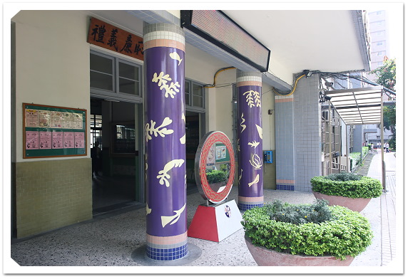 從大門進入校園,首先映入眼簾的是兩根圓型立柱。亮麗的紫色搭配白色圖案,令所有到校的來賓為之ㄧ亮。圖案取材自西洋野獸派大師馬諦斯的作品—海洋,將其中的元素重新組合創作出目前呈現於立柱表面的圖案,其所表達的是「快樂學習、健康成長」的意象,結合學校願景—健康。