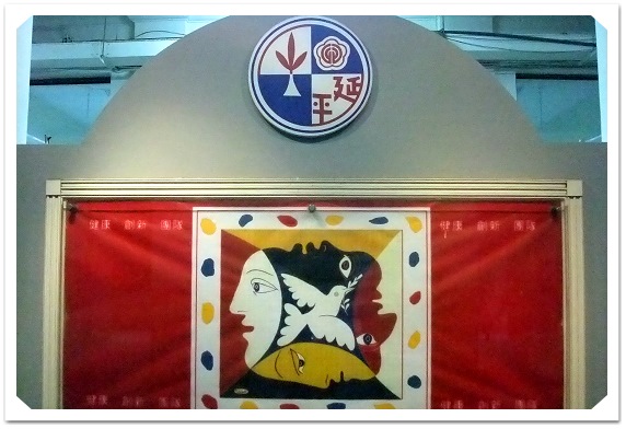 進入中穿堂,清楚看到本校校徽及一面壁畫。壁畫取材自立體派大師畢卡索的畫作—和平,在此所要表達的是包容和諧、分工互助、團隊合作的意象,彰顯學校願景—團隊。
