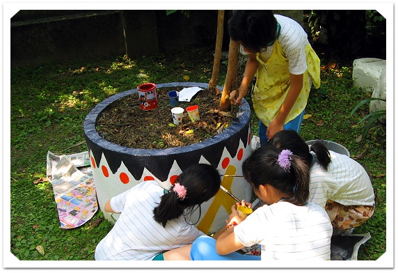 分布於校園各角落的巨石及花臺,與周邊綠草如茵、豐富的生態環境顯得格格不入,藉由美勞老師的指導,學童的小組合作,創作出一個又一個的生命力,冰冷的石頭搖身一變,成為孩子創意的畫布,凡走過必留下痕跡,校園裡處處可見學童快樂學習的成果。