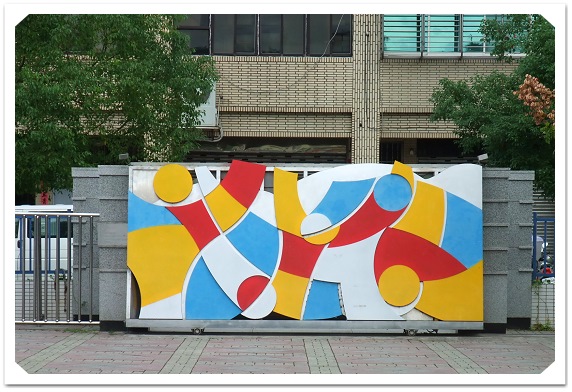 四種顏色,勾勒出一幅鮮明的圖樣,作品名稱為—智與樂。坐落於學校後門入口處中央的藝術作品,係為93年配合溫水游泳館新建工程而設置之公共藝術,其所表達的是以孩童的生活為重心,採用現代感的人物造型及鮮明的色彩,展現出人文教育的重要意涵。當初設計完稿之後,還經過全校師生投票表決通過才定案,讓學童參與學校政策,頗具教育意義。